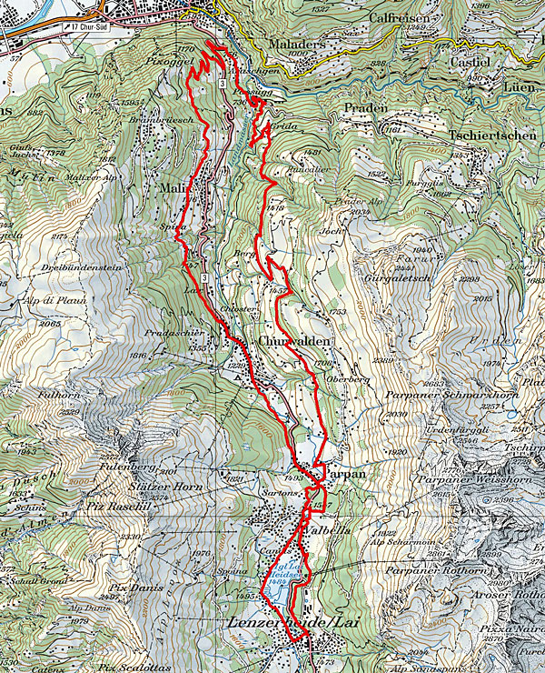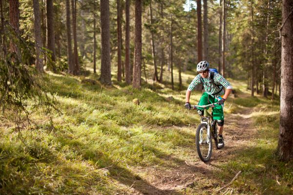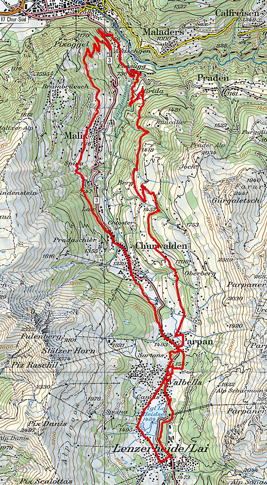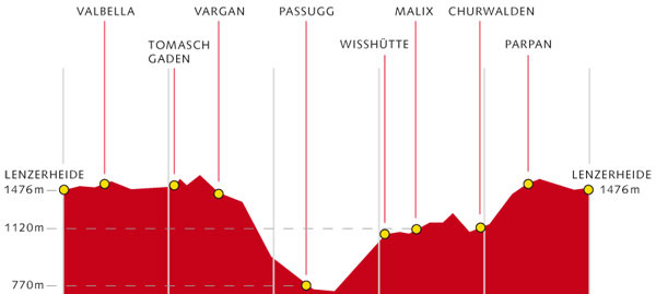 schmalen Pfaden im Gaziwald trifft man nur wenige Wanderer an und fast keine Mountainbiker. Die Tour besteht vor allem aus gepflegten Trails, Waldboden und Wurzelpfaden. Von Lenzerheide aus fahren Sie Richtung Valbella und Parpan. Über den Mittelberg erreichen Sie die Lichtung Büel, ehe der beschilderte Wanderweg nach Grida den Einstieg in den steilen Waldtrail markiert. Weiter gehts steil bergab bis nach Passugg – Ursprungsort des «Passugger» Mineralwasser. Hier wurden 1863 in der Rabiosaschlucht die zuvor verschütteten Heilquellen wieder entdeckt und sind heute Grundlage der in der ganzen Schweiz bekannten Passugger Mineralwasser. Sichere Bikebeherrschung und gute Kondition ist auch auf dem Rückweg wichtig, denn dieser führt vom Kurhaus Passugg übers Känzeli zur Wisshütte. Ein schmaler Wanderweg bringt Sie nach Malix und danach via Churwalden und über die «Parpaner Höhe» zum Ausgangsort Lenzerheide.