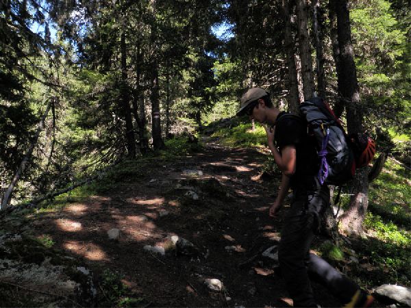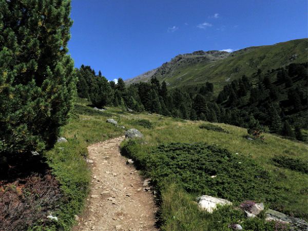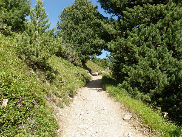 Ganz zu Beginn gerade am Haus "Acla Marga-rita" vorbei und ab da beginnt die Steigung. Zuerst auf schmalen Spuren durch den Wald, auf dem breiteren Strässchen können die Kurven auch abgekürzt werden.