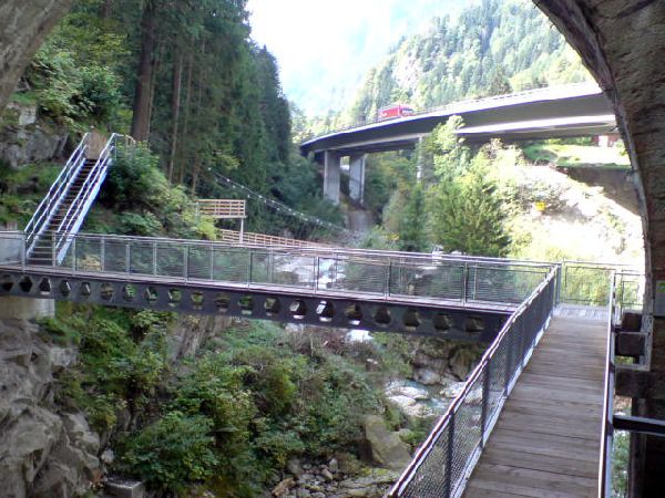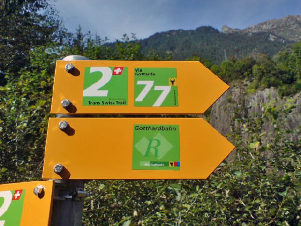 BeschreibungDer Gottardo-Wanderweg Nord startet in Erstfeld. Zuerst geht es der Reuss entlang bis zum Selderbach bei Tägerlohn. Der eigentliche Bahnwanderweg führt weiter via die Dörfer Tägerlohn und Silenen nach Amsteg. Dem Weg der Reuss entlang führt der „Trans Swiss Trail 2“ und die „Via Gottardo 77“, welche auf weiten Strecken identisch mit dem Bahnwanderweg sind. In Amsteg beginnt der Aufstieg zum verträumten Weiler Hinter Ried. Eine eigens erstellte Plattform bietet einen ersten Ausblick auf die schöne Landschaft, die verschiedenen Verkehrswege und das gegenüber liegende Dorf Intschi. Via den Weiler Meitschligen erreichen wir einen weiteren Aussichtspunkt, bevor der Abstieg zum Tobel des Fellibachs, über eine neu erstellte Treppenanlage erfolgt. Für die Bewältigung des Tobel und die Überquerung der Reuss waren verschiedene neue, beeindruckende Treppen, Stege und Brücken erforderlich. Aus dieser Sicht kann dieser Wegteil ohne Übertreibung als Kernstück der Wanderwegs Nord bezeichnet werden. Nachdem der Weg bis dahin auf der rechten Talseite und hoch über der Reuss verlief, wechseln wir auf die linke Talseite und wandern nun der Reuss entlang. Wir folgen dem Weg zwischen dem Wildbach und dem Bahntrassee bis zum Dorf Gurtnellen-Wiler, wo auch die erste Bahnkehre beginnt. Wir ersteigen den Pfaffensprung und wechseln beim Stausee für kurze Zeit wieder auf die rechte Talseite, bevor der Aufstieg zum Dorf Wassen auf der linken Talseite weiter geht. Im Gegensatz zur Reise mit der Bahn, sieht man vom Wanderweg das berühmte Kirchlein von Wassen nur selten. In engem Kontakt mit allen Verkehrswegen des Reusstals wandern wir, bis kurz vor dem Weiler Wattingen, auf der Hauptstrasse. Wieder auf Wanderwegen beginnt hier der lang gezogene Aufstieg Richtung Göschenen. Dabei wird der Weg immer anstrengender, wobei auch zwei kleinere Tobel mit entsprechenden „Wanderweg-Kunstbauten“ zu meistern sind. Auf dem Weg über der Einfahrt zum Autobahntunnel bietet sich ein letzter prächtiger Ausblick auf das ganze Reusstal. Noch einmal ist ein kurzer Aufstieg zu bewältigen, bevor wir dem Bahntrassee folgend den Bahnhof Göschenen erreichen.