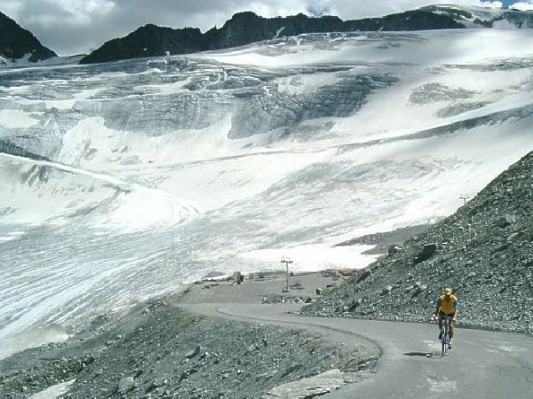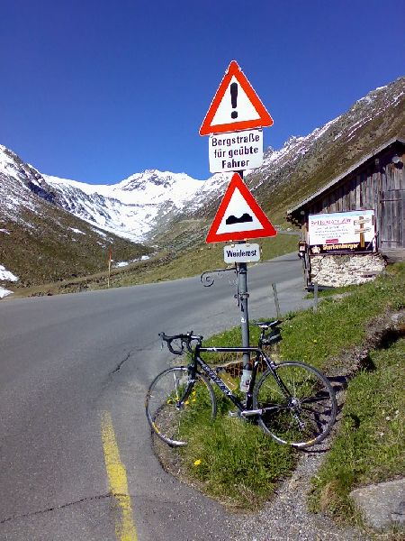 Hier befindet sich die einzige Passage auf der man sich kurz erholen kann (300 m). Wir passieren die Mautstation um ab nun wieder gleichmäßig nach oben zu "klettern". Das Gletscherpanorama schon vor Augen zieht sich dieser Steckenabschnitt gemein in die Länge bis wir in die nächste Kehre kommen. Noch drei Kehren und die letzte längere Gerade und wir biegen ein zum Parkplatz Rettenbachgletscher - noch ein kleiner Stich beim Restaurant vorbei und es ist geschafft das Gletscherstadion liegt vor uns.