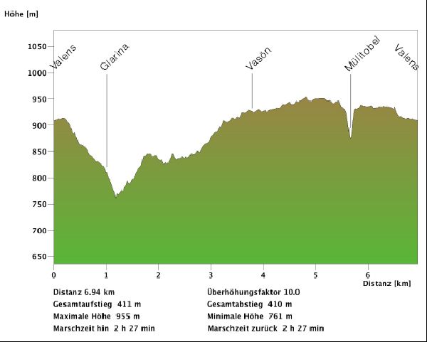 Die Beschreibung erfolgt im Gegenuhrzeigersinn. Start und Ziel liegen bei der Klink in Valens. Auf dieser Rundtour befinden sich zahlreiche ???? Trinkbrunnen. Starten Sie, wie bereits geschrieben im Gegenuhrzeigersinn Richtung Vasön. Folgen Sie der Beschilderung, die Sie bei der Klinik vorbei führt und nach ca. 100 m zur ersten Verzweigung der Routen führt. Hier gehen Sie geradeaus. (Richtung links führt auf die Route Glarina). Nach einer kurzen Steigung von ca. 250 erreichen Sie die nächste Verzweigung. Da geht es links. (Geradeaus führt auf die Route Sandgrueb und Geissegg). Bei der Brücke kommt die 3. Abzweigung. Auch da geht es links. (Geradeuas führt auf die Route Geissegg). Nun geht es bei Vasön vorbei bis zur Harnadelkurve oberhalb Mapraggsee. Der Weg führt dann paralell zur Tamina durch Wald und offene Wegabschnitte mit wunderbarer Weitsicht. Am Ende der Waldstrasse geht es einen steileren Weg nach Valens hinauf.