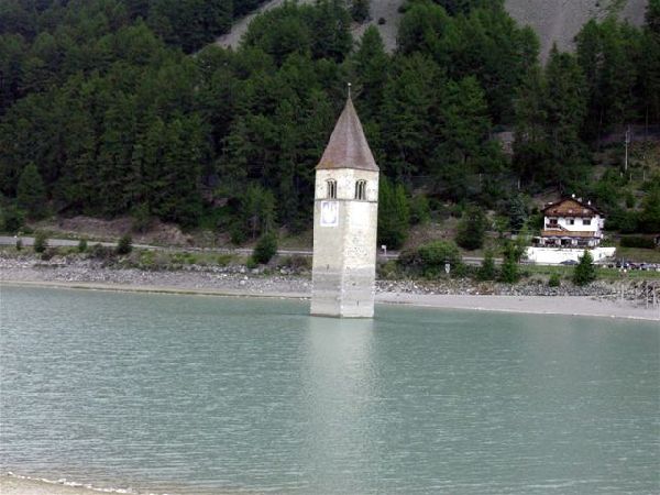 Nach der Schlucht gibt es wieder ein paar fahrbare Abschnitte bis zur Sesvennahütte auf 2256m, die auf italienischem Boden liegt. Nach den körperlichen Strapazen haben wir hier wahrscheinlich unser bestes Bier seit langem genossen. Von hier aus beginnt die erste lange Abfahrt hinunter ins schöne Vintschgau. Nach Burgeis steigt der Weg wieder bis zum Heidersee wieder an. In Graun am Reschensee (zweiter Stausee) ragt der alte Kirchturm des versunkenen Dorfes noch aus dem Wasser.