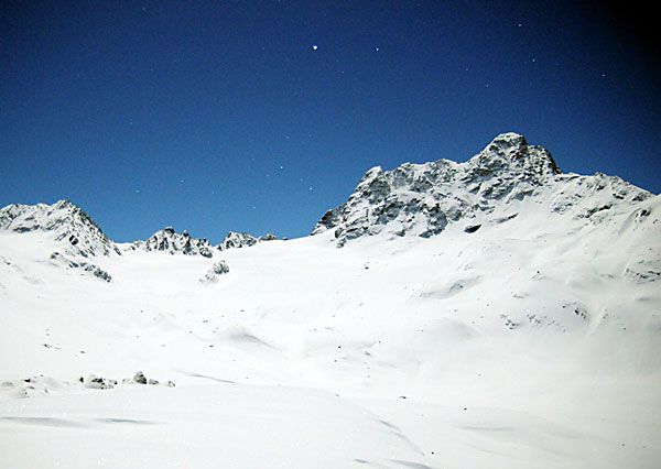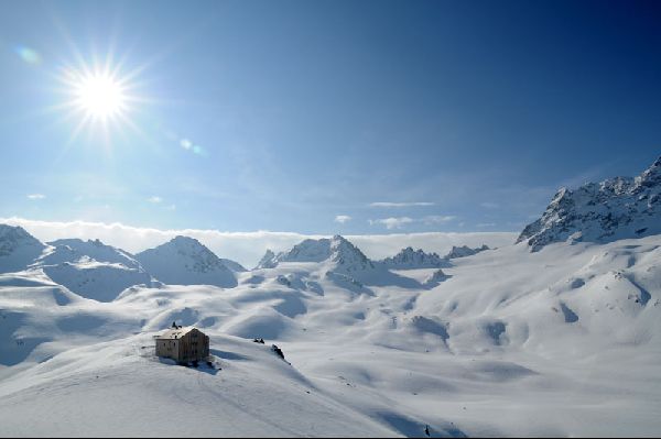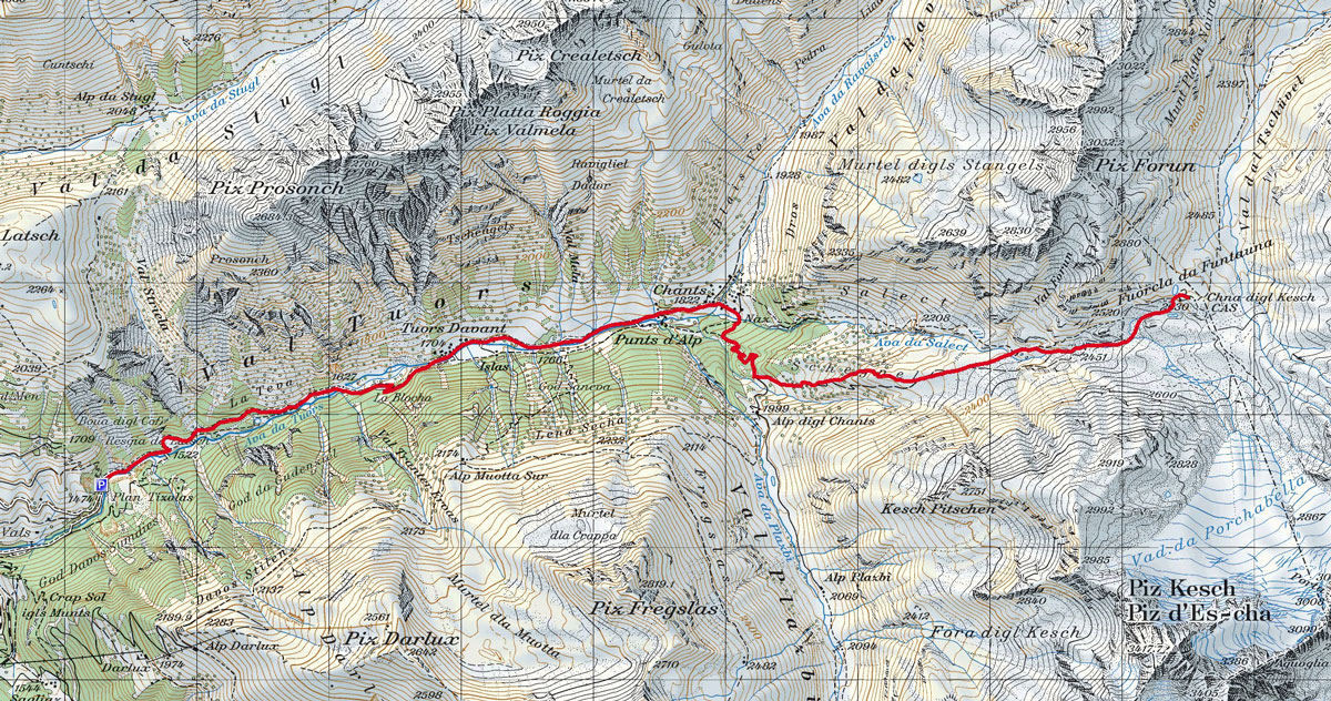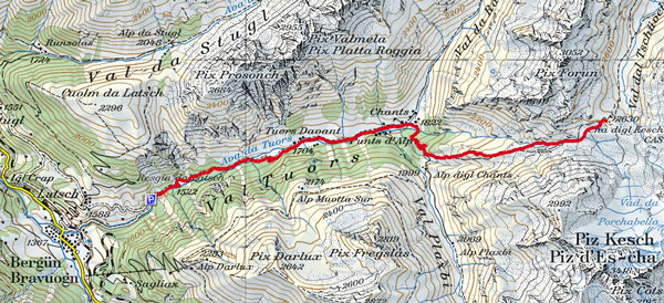 Ab da erst gemütlicher Aufstieg durch das winterlich ruhige Val Tuors. Der Weg führt vorbei an den tief eingeschneiten Weilern Tours-Davant, Punts d'Alp und Chants. Da beginnt dann auch der eigentliche Anstieg zur Keschhütte. Ab Chants gehts es zuerst in Richtung Süden auf der Strasse zur Alp-Plazbi. Nach genau 1.2 km zweigen wir links ab und folgen ab hier dem Bergweg bis zur Keschhütte. Bei sehr viel Schnee wie zur Zeit helfen die langen roten Markierungsstangen den richtigen Weg zu finden. Viel Spass.