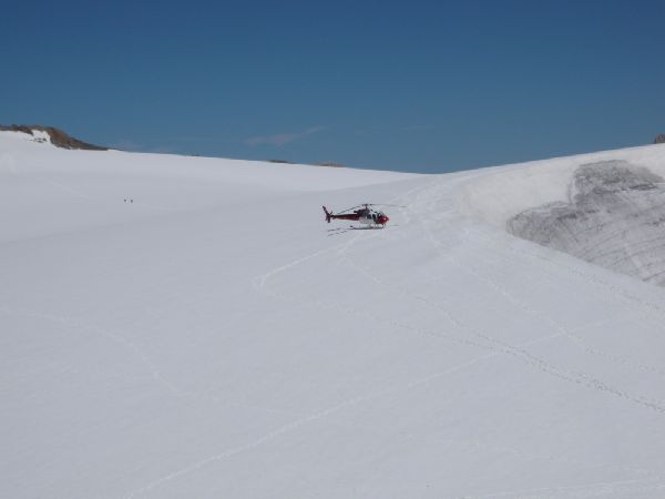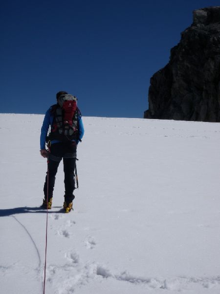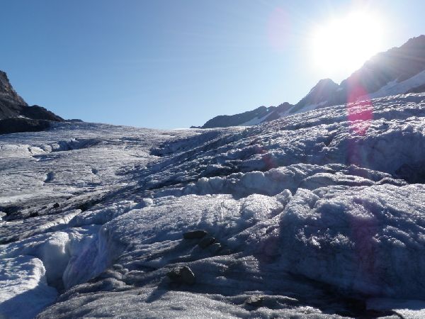 Die ersten 500m sind auf Geröll, bis man am Gletscher ist. Danach hält man sich auf der rechten Seite des Gletschers, das Ziel, die Planurahütte immer im Blickfeld. Auf dem zweiten Teil des Wegs steigt es etwas mehr an.