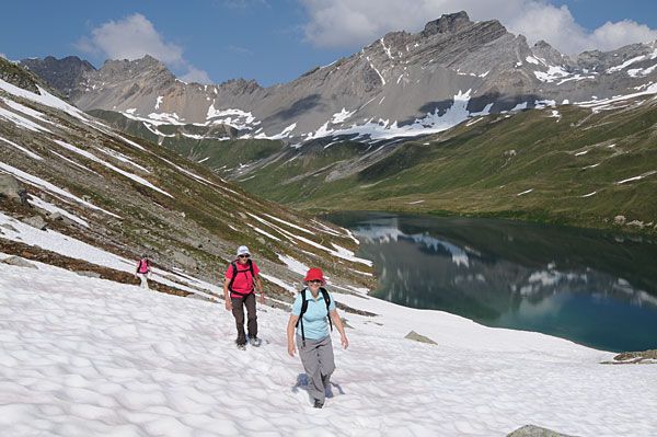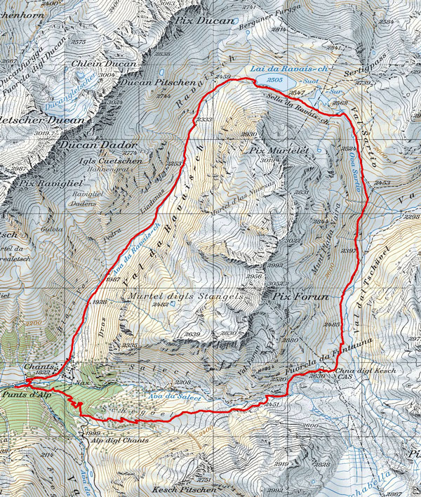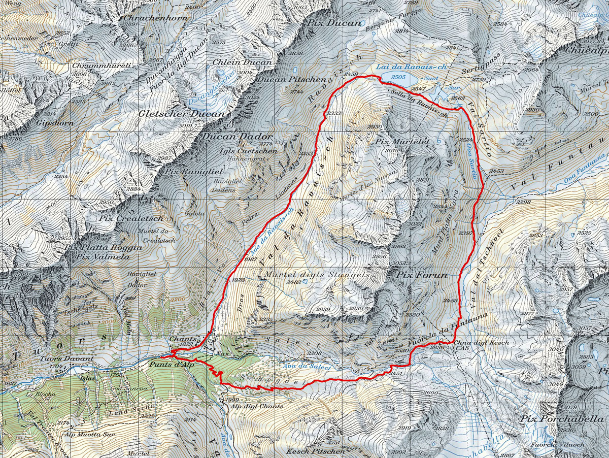 BeschreibungDiese Rundtour vorbei bei den Ravai-ch Seen und dem Besuch der Kesch-Hütte ist ein Klassiker. Im Uhrzeigersinn mit dem moderaten Aufstieg auf sehr guten Wanderwegen zu den Seen und Weitermarsch auf dem Panoramatrail bis zur Keschhütte ist diese Rundtour für jedermann / frau in 4 bis 6 Stunden gut machbar.Obacht: Vor Mitte Juli sind zum Teil grössere Schneefelder zu queren. Wanderschuhe sind also empfohlen. Von der RhB Station Bergün fährt der Postbus oder das Alpentaxi (http://www.mountain-tours.ch) bis zum Ausgangspunkt der Tour nach Chants ins Val-Tuors.