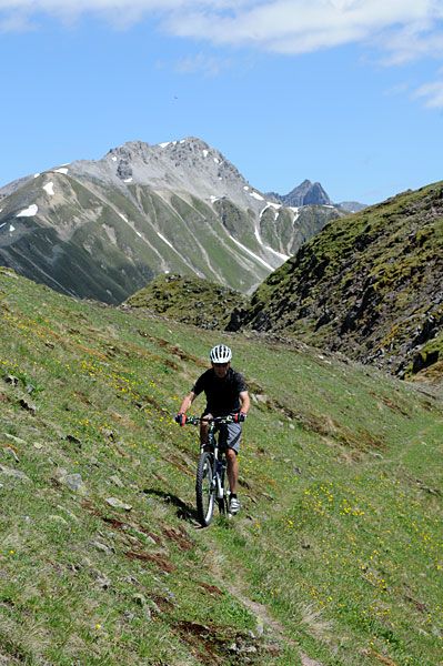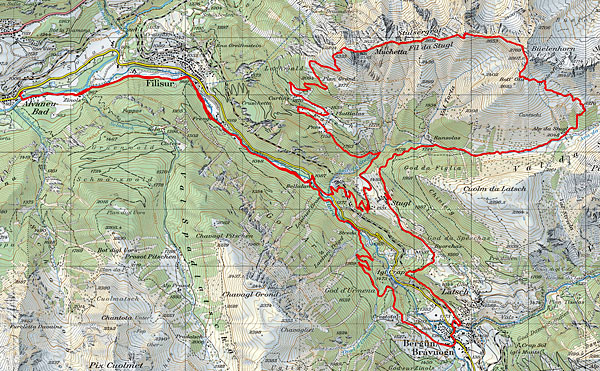 BeschreibungHier handelt es sich um eine ziemlich spektakuläre Biketour nur für hartgesottene Biker !Die Tragepassage von der Stulser Alp hinauf zum Grat dauert über eine Stunde. Zudem wird an einigen Stellen auf dem Grat "Trittsicherheit" vorausgesetzt ! Die Fahrt auf dem Grat und die Abfahrt vom Muchetta bis nach Falein verlangt sehr viel technisches Können. Anfängern und Durchschnittsbikern ist diese Tour daher NICHT zu empfehlen !!