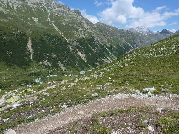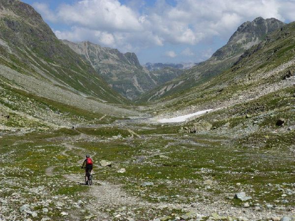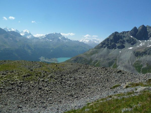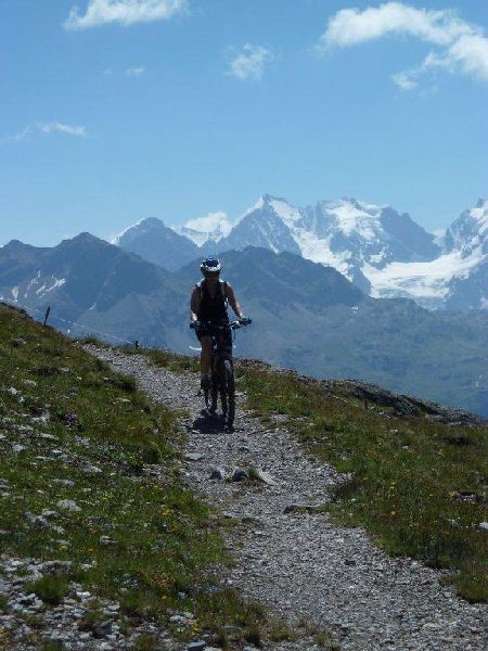 Damit wir nicht zu viele Höhenmeter absolvieren mussten, sind wir mit der Corviglibahn von St.Moritz bis zur Corviglia auf 2486m hochgefahren. Die Tour ist für konditionell gut trainierte und technisch versierte gut fahrbar. Wir als Amateure mussten die erste steile Rampe bis nach der Alpinahütte schieben. Bis zum Suvrettapass mussten wir aus Sicherheitsgründen einige Male ganz kurz absteigen. Ebenfalls in den steilen engen Kurven vor Zembers da Suvretta im Beversertal, mussten wir die Bikes ca. 500m schieben. Die Tour rund um den Piz Nair bietet viele schöne Aussichtspunkte. Die Abfahrt dem Beverin entlang durch das Val Bever ist wunderschön. In Spinas kann man sich bestens verpflegen.