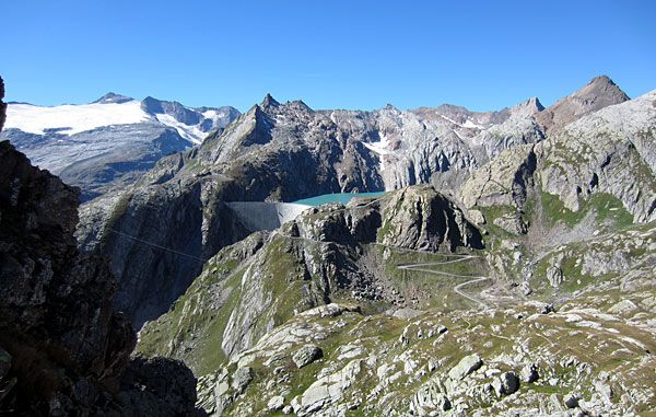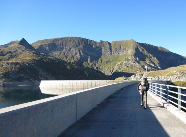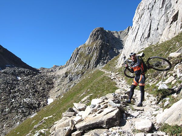 Am Ende der Staumauer ist auch der „Weg“ zu Ende. Nochmals etwa 2 km Schieben, Tragen und Klettern für die letzten 120 Höhenmeter des Tages bis auf den Passo-del-Naret.
