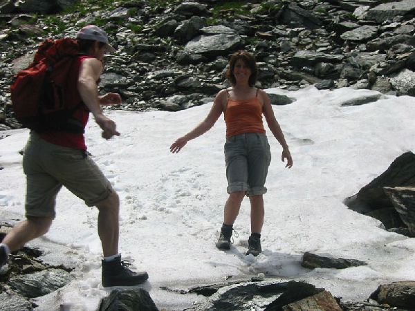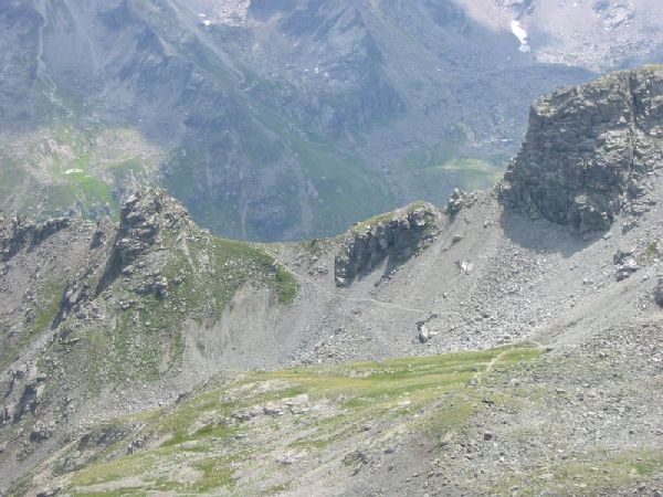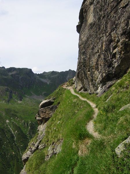 Wir gehen bis zum Schafbodenjöchli. Dies ist der schwierige Teil der Wanderung. Auf engen Pfaden an steilen Abgründen vorbei, über Steinabrüche, wo fast kein Weg zu sehen ist und für die Füsse fast kein Platz. Ein etwas mulmiges Gefühl ist es da schon, und schwindelfrei sollte man sein. Zeitweise müssen die Hände zur Hilfe genommen werden. Oben am Schafbodenjöchli angekommen, ist man erst mal froh, alles überstanden zu haben.