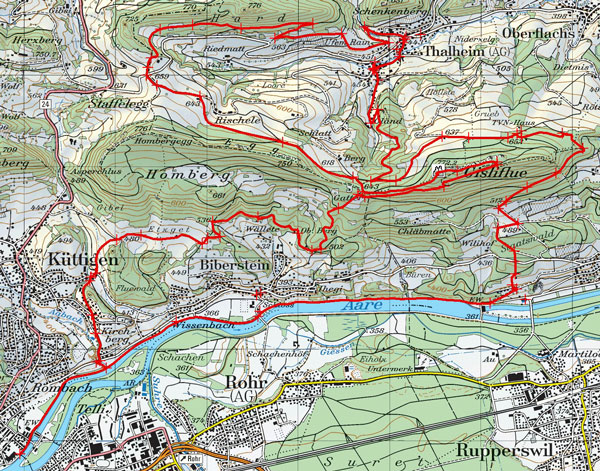 Die Tour führt auf die Gisliflue, von wo man eine traumhafte Aussicht auf das Mittelland, den Jura, die Alpen und den Schwarzwald hat. Danach fährt man noch ein bisschen durch das Schenkenbergertal und schliesslich gemütlich der Aare entlang zurück.