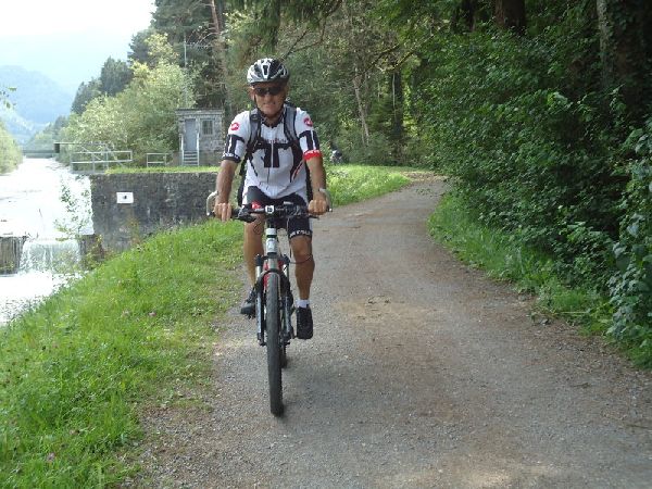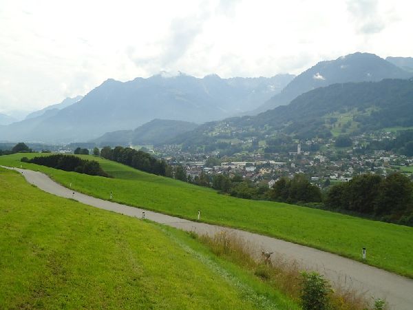Rtg Bahnlinie nach 100 m nach lk, BW; den BW folgen bis zum Zollamt Rüthi, Rhein überqueren auf die österreichische-Seite, dort unmittelbar nach rt auf dem Rheindamm BW „Vaduz,Rugell“,