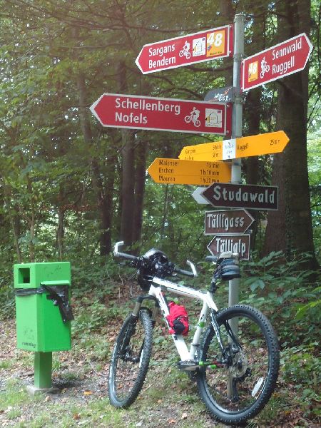 in Ruggell Kanal überqueren Rtg Dorf Ruggell, beim Kreisel BW „Bendern,Schellenberg“, immer BW folgen, Naturstrasse im Wald hinauf,