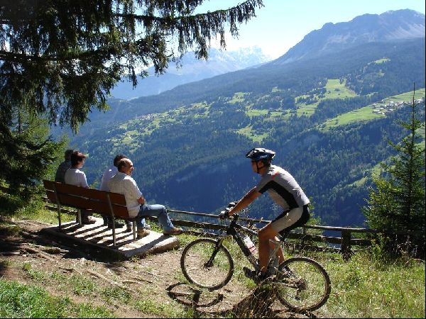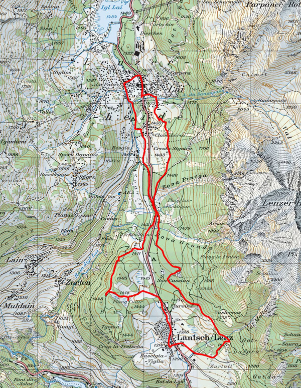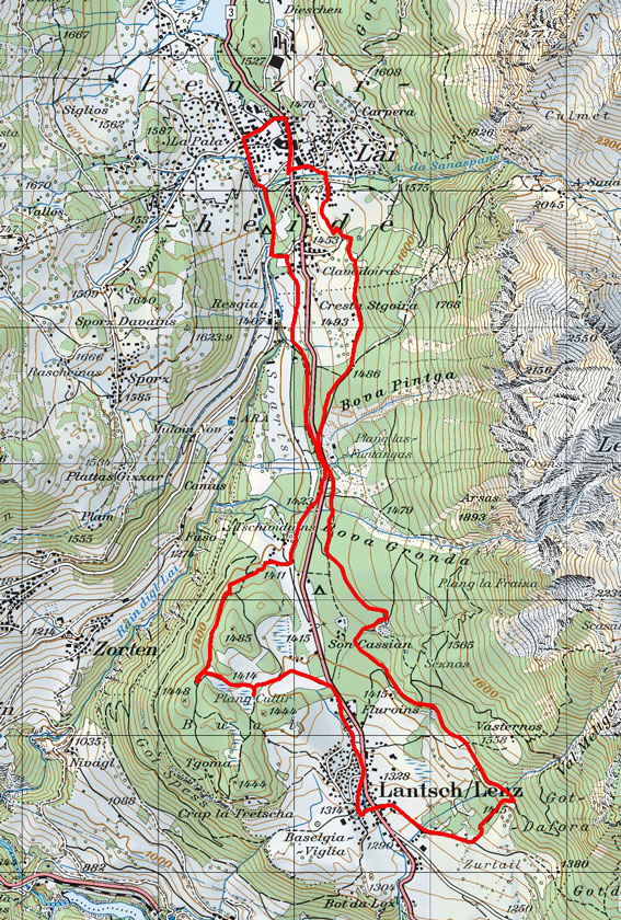 BeschreibungDie Tour beginnt im Ortszentrum beim Tourismusbüro in Lenzerheide (1476 m ü. M) und führt mitten durchs Dorf Richtung Lenz. Nach ca. 600 Meter biegt man vor der Bäckerei Hafner links ab und fährt zum Ferienhaus Sanaspans (1506 m ü. M). Von dort folgt man rechts dem Singletrail Cresta Stgoira, von wo man schon die erste schöne Aussicht übers Hochtal geniessen kann. Hier wartet bereits die erste leichte Abfahrt auf einem ausgebauten Forstweg bis zum Kieswerk Bovas (1420 m ü. M). Das nächste Ziel ist Rofna oberhalb von Lenz (1450 m ü. M). Die super Aussicht ins Oberhalbstein und zu Piz Mitgel, Piz Nair und Tinzenhorn lädt zu einem gemütlichen Picknick ein. Danach wartet auch schon die zweite Abfahrt nach Lenz. Von Lenz fährt man entlang der Hauptstrasse Richtung Lenzerheide bis zum Grossen Parkplatz Foppa (1380 m ü. M). Vom Parkplatz dem coupierten Waldweg bis zum Restaurant Muloin (1395 m ü. M) folgen. Hier beginnt der letzte Aufstieg über den Campingplatz bis nach Lenzerheide.