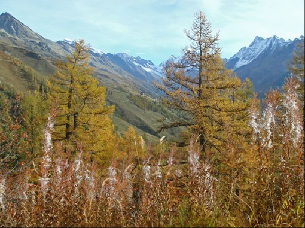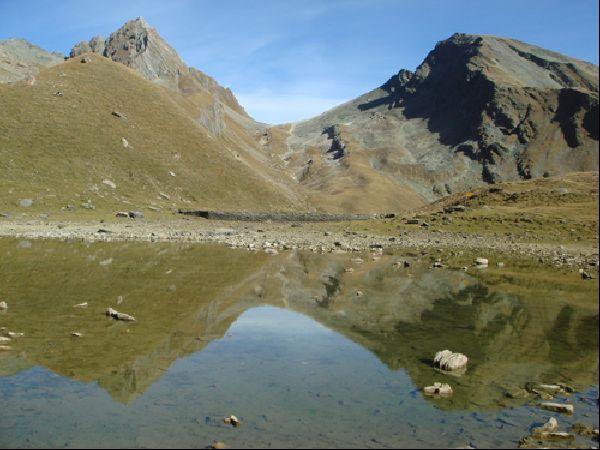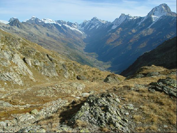 Dann führt der Weg talwärts zum Wysse Seeli, das gegen Herbst kaum mehr Wasser hat (siehe Bild). Ab hier steigt der Weg wieder leicht an. Wir geniessen die Aussicht auf die Walliser 4'000 er. Im Restaurant der Bergstation Torrent (Rinderhütte) machen wir noch eine Pause bei einem Bier. Eigentlich kann man von hier die Luftseilbahn nach Leukerbad nehmen. Wir aber stiegen zu Fuss ab (ca. 1Std.30 bis 2 Std.).