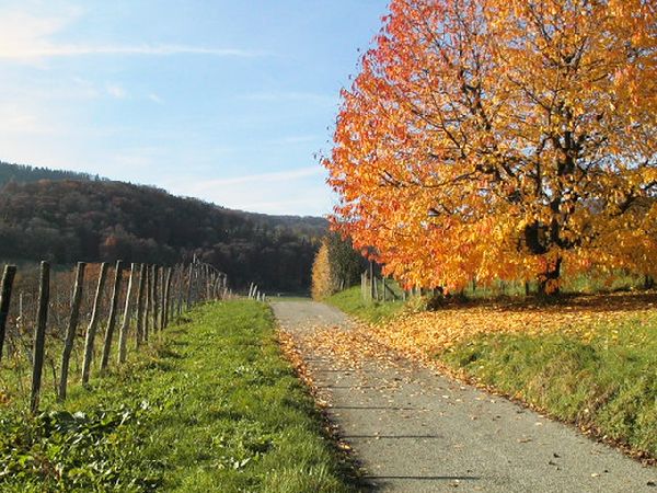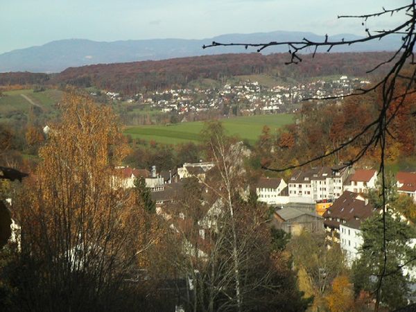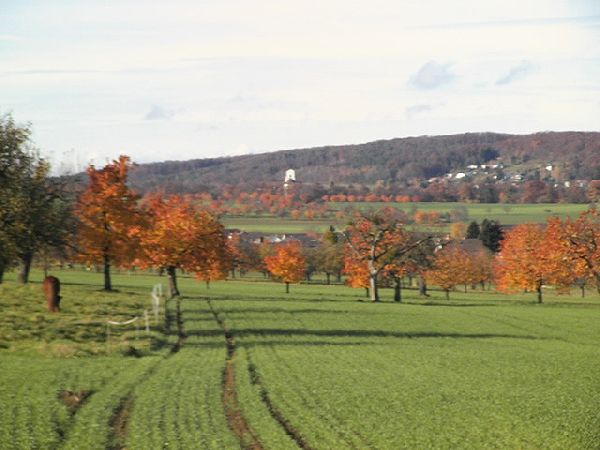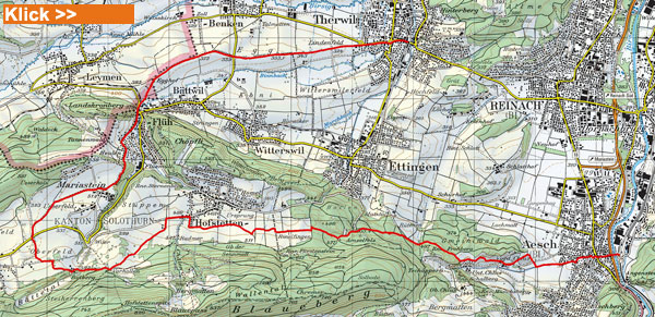 BeschreibungEine Wanderung in das Gebiet des Blauen startet man mit Vorteil in Aesch BL. Vom Bahnhof in der Talebene der Birs durchquert man das Dorf in westlicher Richtung zur Chlus, wo der Hügelzug des Blauen beginnt. Je nach Jahreszeit nimmt man den Weg Mitten durch die Rebberge oder durch den Wald. Im Herbst empfiehlt sich der Rebenweg, welcher am Ende der Chlus in den Wald führt. Oberhalb des Amselfels endet der Waldteil und man betritt unvermittelt die Hochebene von Hofstetten. Das Dorf liegt am südlichen Hang des Witterswiler Berges in der solothurnischen Enklave im Bezirk Dorneck. Die Ebene ist durchsetzt mit Kirschbäumen, welche im bunten Laubkleid geradezu faszinieren. So wähle ich nicht den markierten Wanderweg dem Waldrand entlang, sondern den Feldweg Mitten durch diese Farbenpracht. Am westlichen Ende des Dorfes steigt der Weg leicht bis zum höchsten Punkt der Wanderung, den Vorhollen. Weiter geht es zum Rotberg mit der gleichnamigen Burg, welche als Jugendherberge dient. Eine Burg, wie aus dem Bilderbuch lautet der Slogan der Betreiber. Von der Rotburg führt der Weg weiter über das Oberfeld bis kurz vor Metzerlen. Wir passieren die Strasse und wandern über das Usserfeld nach Mariastein. Mariastein ist ein bekannter Wallfahrtsort mit einem Benediktinerkloster. Eine Besichtigung der barocken Klosterkirche mit der Mariengrotte ist empfehlenswert. Dem Waldrand entlang führt der Wanderweg hinab nach Flüh, mit Blick zur Burg Landskron, welche bereits auf französischem Boden liegt. Flüh ist gewissermassen das Tor vom Hochplateau von Hofstetten zum Leymental. Mit einem gültigem Ausweis kann der Weg zum Egghof und der Grenze entlang, über die Egg genommen werden. Über den Hügelzug zwischen der Birsig, mit Blick auf Biel-Benken und dem Binnbach, mit Blick auf Witterswil, ebenfalls mit vielen bunten Kirschbäumen durchsetzt, gelangen wir nach Therwil, dem Ziel der Wanderung. Ab Therwil fährt die 10er Tramlinie der BLT im 10-Minutentakt zum Bahnhof Basel SBB. Der vielen Kirschbäume wegen empfiehlt sich diese Tour auch im Frühling zur Blütezeit der Kirschen. Im Sommer ist der markierte Wanderweg, entlang dem Waldrand, statt durch die Ebene von Hofstetten empfehlenswerter.