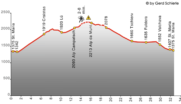 BeschreibungWichtiger Hinweis: Die Daten zu dieser BIKE-EXPLORER Tour wurden uns freundlicherweise von Frau Michelle Schierle, Schierle Multimedia zur Verfügung gestellt. Die CD-ROM mit Landkarte "Bike-Explorer UNTERENGADIN" (Autor Gerd Schierle) mit Infos über die schönsten Biketouren im Unterengadin und im Val Müstair erhalten Sie direkt bei >> www.Bike-Explorer.ch.