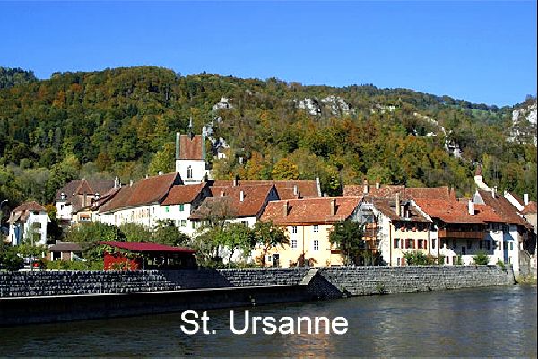 BeschreibungDie Wanderung beginnt am Knie des Doubs beim Bahnhof von St. Ursanne. Nach rund einem Kilometer durchqueren wir das mittelalterliche Städtchen und folgen der Strasse Richtung Pruntrut. Schon in der ersten Kehre der Strasse beginnt der markierte Wanderweg und führt ziemlich direkt zur Passhöhe mit dem Weiler Col de la Croix. Auf der Passhöhe folgen wir der Strasse in nordwestlicher Richtung zum Hof Sur Plainmont. In der Nähe befindet sich eine kleine, einsame Kapelle. Ab diesem Punkt führt die Wanderung abwechselnd über Alpwiesen und durch Wälder ohne grosse Höhendifferenzen. Zwischendurch wird der Blick auf die Ajoia auf der rechten Seite und das Tal des Doubs auf der linken Seite, mit dem Clos du Dubs im Hintergrund frei. Nach der Alp Les Chainions erreichen wir Pâture de Calabri und kreuzen die Passverbindung zwischen den erwähnten Tälern. Weiter geht die Wanderung durch den Wald Les Laives zur Landesgrenze CH / F, der wir nun über eine längere Wegstrecke folgen. Über Gros Buissons, bei Montancy F, Sur les Roches, vorbei an der Vacherie Dessus erreichen wir das Dorf Roche-d’Or. Nach dem Abstieg durch den Wald La Montagne erreichen wir die berühmten Grotten von Réclère mit dem angegliederten Dynosaurier Park. Vorbei am Ausflugsrestaurant führt der Weg zur Hälfte durch den Wald und über Wiesen zum Ziel, dem Grenzdorf Damvant. Für die Rückreise zum Bahnhof Pruntrut vorher unbedingt den Postautofahrplan beachten. Es gibt nur einen Kurs am Mittag und gegen Abend! . Für den Besuch der beiden Sehenswürdigkeiten empfiehlt sich ein separater Ausflug in die Ajoia.