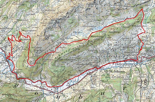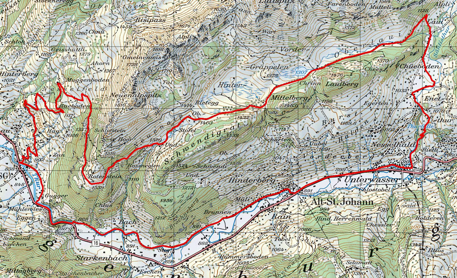 BeschreibungAb Unterwasser Dorfplatz dem Dorf entlang und danach auf der Hauptstrasse bis Alt St. Johann, im alten Dorfteil (rechts halten) auf Nebenstrasse und nachher Wanderweg bis zum Kieswerk Starkenbach. Auf Kantonasstrasse bis Dorfeingang Stein. In Stein auf Nebenstrassen bis ref. Kirche, Dem Weg in Richtung Risipass folgen bis Rueboden. Dort rechts abzweigen und Strasse folgen bis Rotenstein. Hier um den Alpstall herumfahren und Wanderweg folgen über Neuenalp - Gräppelensee runter zur Laui. Hier der Strasse in Richtugn Unterwasser folgen.