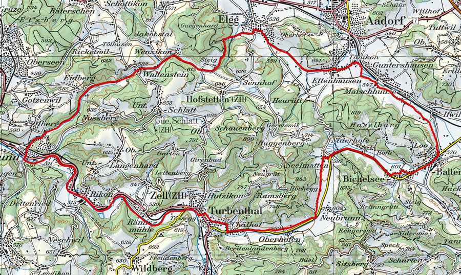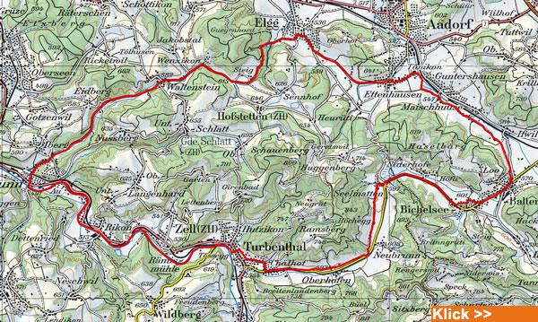 BeschreibungOhne Bad im Bichelsee, aber mit Blick für die alten Obstgärten in Maischhuuse und nach Elgg mit Schwung die kurze Rampe hinauf zurück nach Turbenthal.