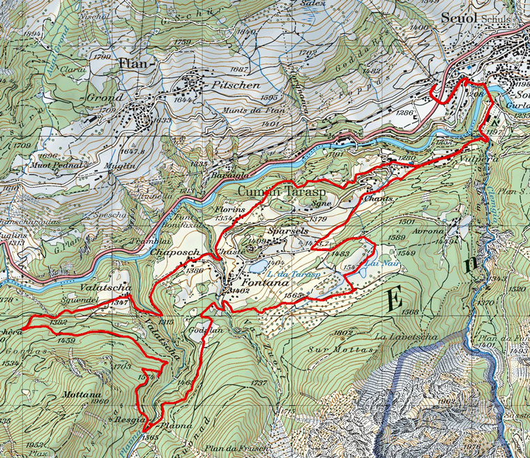BeschreibungStart beim Hotel Bellaval in Scuol. Abwärts durchs Dorf Scuol Richtung Gurlaina (über die Hohe Brücke) und dann Richtung Vulpera. Fahrt durch Vulpera Richtung Tarasp. Hinter dem Golfclub Restaurant vorbei. Wunderschöner Trail entland den ersten 3 Löcher des hochalpinen Golfclub Vulpera.