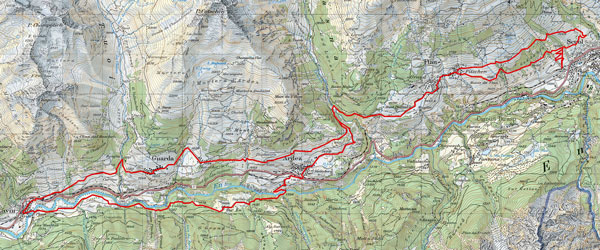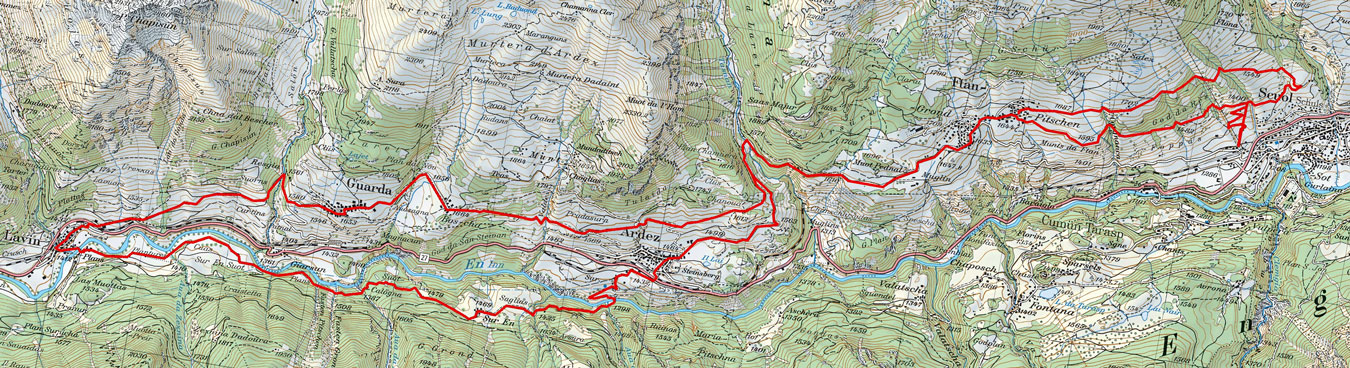 BeschreibungStart beim Hotel Bellaval in Scuol. Direkt hinter dem Hotel beginnt die Tour. Steiler Aufstieg unterhalb der Gondelbahn, bevor man auf einem Höhenweg mit sensationeller Aussicht auf die andere Talseite und das Schloss Tarasp nach Ftan kommt. Durch Ftan Richtung Ardez. Mitten im Wald gehts scharf rechts weg und dann auf dem Höhenweg über Ardez nach Bos-cha bis ins Schellenursli Dorf Guarda. Tip: Hier unbedingt auf einer der schönsten Sonnenterrassen des Unterengadins Halt machen, im Hotel Meisser mitten in Guarda. Anschliessend gehts in einem schönen Downhill auf einem Forstweg Richtung Lavin. Durch das Dorf auf die andere Talseite. Das Tal ist offen und hoch über dem Inn fahren Sie, mit einigen Steigungen, Richtung Scuol. Vorbei am kleinen Weiler Sur-En - trinken Sie hier aus dem Dorfbrunnen glasklares Bergquellwasser. Nun folgt ein steiler Aufstieg nach Ardez und zurück auf dem Höhenweg nach Ftan. Fahren Sie durch Ftan und dann auf einem weiteren Höhenweg über den Mot Morel, unter der Gondelbahn durch nach Flöna. Dann zurück Richtung Scuol und Hotel Bellaval. Hier geniessen Sie am Besten in der neuen Sommerlounge einen kühlen Drink und lassen den Tag Revue passieren...