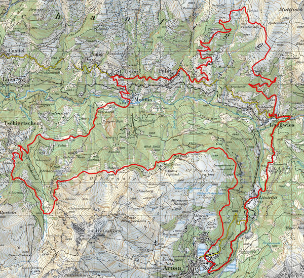 BeschreibungVon Arosa führt die Tour über einen schönen Weg zur Ochsenalp. Danach folgt eine rassante Abfahrt nach Molinis. Nun geht es 1000 Höhenmeter hinauf zur Peisteralp. Von Molinis bis zum Abzweiger zur Peisteralp auf geteerter Strasse. Danach auf einer landwirtschaftlichen Strasse bis zur Peisteralp, wo wir den höchsten Punkt der Tour erreichen. Von 2040 Meter folgt nun eine Abfahrt bis nach Langwies, von wo es nochmals 400 Höhenmeter zurück bis nach Arosa sind.