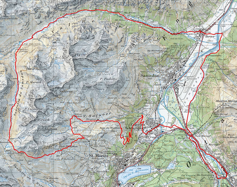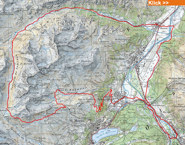 Eine Einmalige Tour im Engadin. Start in Pontresina. In Celerina dem Forstweg auf Marguns folgen. Danach bis zur Alpina-Hütte. Nun den Hang queren bis zum Sellellift. Ab hier Trail ohne Ende um den Piz Nair bis nach Bever. Ziel Pontresina