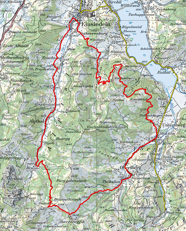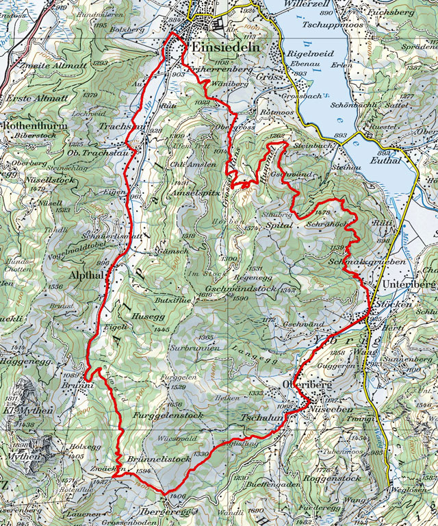 BeschreibungDie Tour geht von Einsiedeln übers Alpthal Richtung Brunni. Vom Gasthof Brunni geht es links in den Wald mit angenehmer Steigung Richtung Mythen zum Restaurant Zwäcken. Ideal für eine kleine Zwischenverpflegung. Ab jetzt geht es über diverse Wegarten... Wiese- Holzträmel- Schotter- oder Kieswege zur Ibergeregg. Abfahrt nach Oberiberg zur Laucheren. Nun geht es über die Hauptstrasse bis Unteriberg. Nun folgt der 2te Aufstieg zum Höhenweg hinauf. Von hier geniessen wir eine super Aussicht über den Sihlsee. Den Höhenweg entlang fahren wir mehr oder weniger gerade aus. Am Schluss führt uns eine kurze Abfahrt Richtung Einsiedeln.