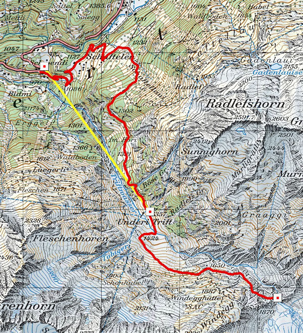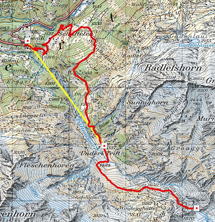 Auf der 25.000-er Karte ist ein Weg von Schwendi via Waldboden zur Unteri Trift eingezeichnet. Dieser Weg ist anscheinend in sehr schlechtem Zustand und zT sehr ausgesetzt. Daher den von uns begangenen Weg nutzen.