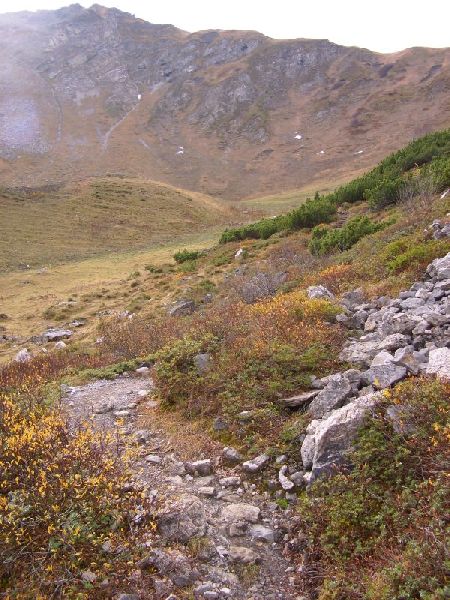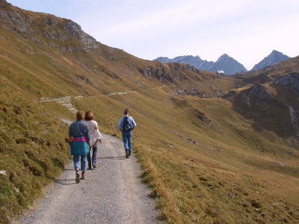 Nach der Tälihöhe geht es wieder etwas abwärts und dann nach einer kurzen steilen Rampe auf breiten Wanderwegen zur Pfälzer Hütte.