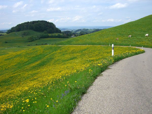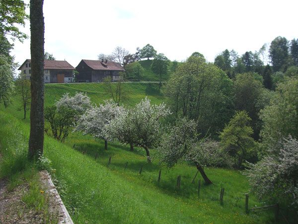 Nach Tablat folgt der Aufstieg Nummer 6 bis Schmiedrüti. Die Gegend wiederhohlt sich auch hier. Einmal auf der Höhe angelangt, fahren wir vorbei am Weiler Sitzberg während mehrerer Kilometer auf der „Panoramastrasse“ und geniessen den Ausblick zum Alpstein, dem Nollen und bei guter Sicht bis zum Bodensee.