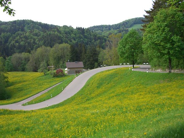 Von der Passhöhe auf 954 müM führt uns die Abfahrt hinunter ins Tösstal nach Steg, dem Wohnort der Snowboard-Olympiasieger Gebrüder Schoch. Nach kurzer Fahrt im Tösstal beginnt bereits in Bauma der nächste happige Aufstieg nach Sternenberg. Der „Stutz“ ist unten direkt nach Bauma sehr steil, wird dann aber bald angenehmer und zudem werden wir durch eine tolle Aussicht belohnt.
